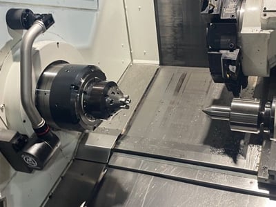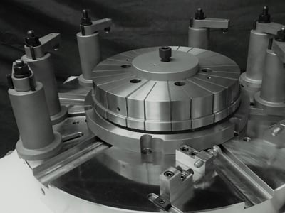 > El destornillador comienza a centrar la pieza, los pasadores se posicionan para acoplarse a la cara y, cuando se aplica la presión adecuada en el contrapunto, el punto central se sujeta con un mandril hidráulico.